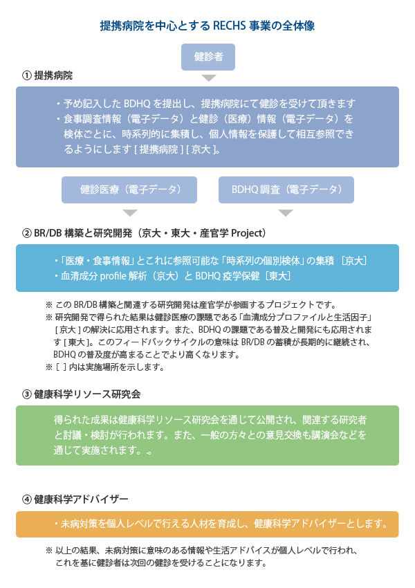 RECHSでは、京大Projectと東大Projectが共にその結果を食習慣改善に応用するとき、個人レベルでの未病対策が可能となることから、単独プロジェクトではなく、両者の相乗効果を狙っております。つまり、検査化学的解析と、食事調査疫学的解析という異質の因子統合によって、より根源的な未病対策を個人毎に実施できる可能性に着目しました。そのためには、健診/検診者の方々を中心とする提携病院の理解と協力が必須であることは言うまでもありません。