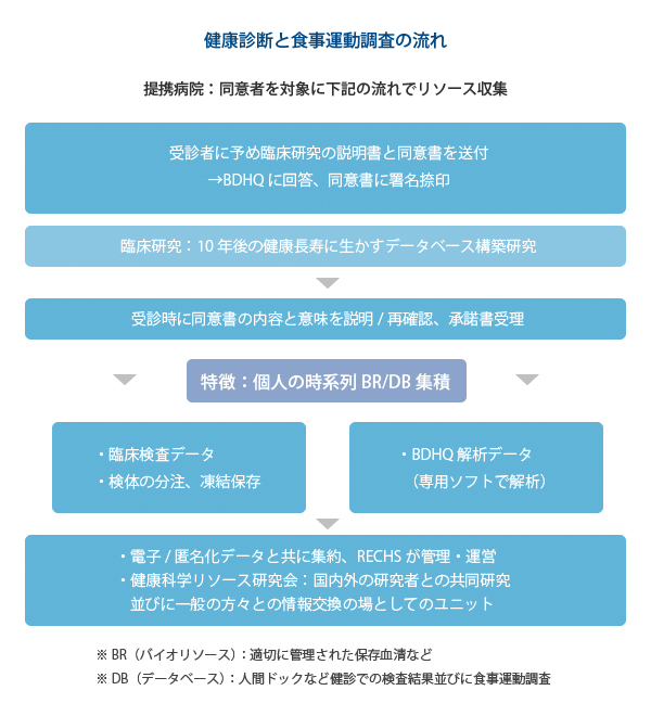 ここに示す流れに沿って、提携病院にてバイオリソース(BR)とそれを基にしたデータベースを集積します。なお、BR(バイオリソース)とは適切に管理された保存血清などを意味し、DB(データベース)は人間ドックなど健診での検査結果並びに食事運動調査情報を意味します。